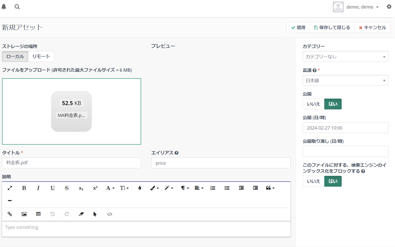 ※[適用]…保存後、同画面に滞留 / [保存して閉じる]…保存後、1つ前の画面に戻ります